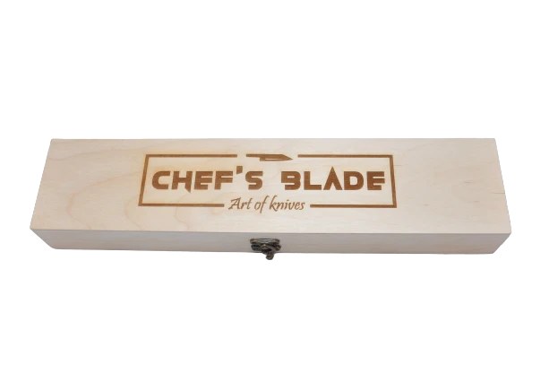 Всеки нож е в индивидуална дървена кутия Chefsblade отново произведена в България. Ножът е положен върху 100% естествена вълна от България.